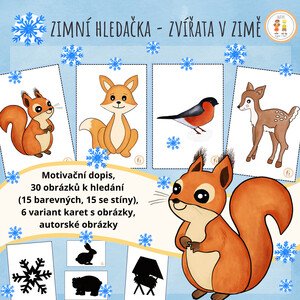 Zimní hledačka - Zvířata v zimě Ahoj děti, jmenuji se veverka Rozárka a bydlím v lese. Nejsou tu jen zvířátka, najdete