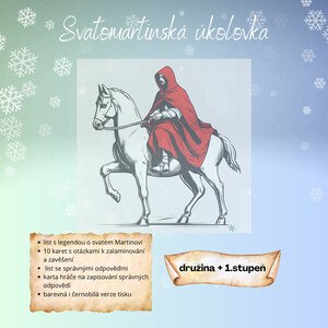 Úkolovka s 10 kartami s otázkami o sv. Martinovi k zavěšení uvnitř i venku. Odpovědi děti zapisují do karty hráče. Za