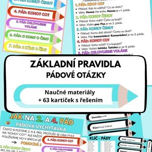 Přehled učiva - pádové otázky + kartičky na aktivitu + výzdoba do třídy Materiál obsahuje: přehledné plakáty s pádovými