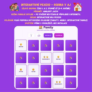 Interaktivní pexeso – Rodina v AJ Tato interaktivní digitální hra je ideálním nástrojem pro procvičování a fixaci slovní