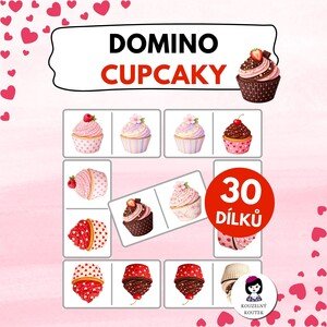 Domino je veselá a barevná hra. Obsahuje 30 barevných kartiček s obrázky cupcaků. Kartičky se skládají podobně jako