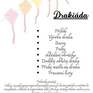 Soubor obsahuje: Příběh Výroba draka Barvy Počty skládání obrázku Dodělej obličej draka Přidej mašle na draka Pracovní