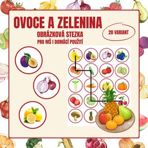 Materiál obsahuje 16 kartiček ovoce (obrázek + název) na formátu A5 a 16 kartiček zeleniny (obrázek + název) na formátu