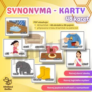 Tento materiál obsahuje sadu kartiček se synonymy - tedy slovy, která mají podobný nebo stejný význam. Synonyma dětem