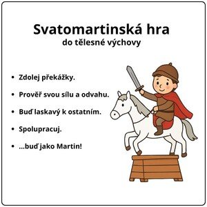 Svatomartinská hra seznamuje s žáky legendu o svatém Martinovi a prověřuje jejich fyzickou zdatnost, odvahu a další