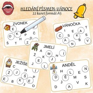 Soubor obsahuje 22 karet s vánočními obrázky a jejich názvy. Děti mají za úkol zakroužkovat smazací fixou písmena tak