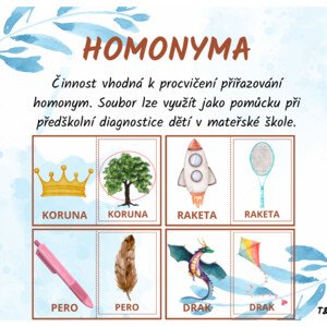 Činnost vhodná k procvičení přiřazování homonym. Soubor lze využít jako pomůcku při předškolní diagnostice dětí v