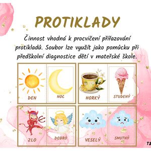 Činnost vhodná k procvičení přiřazování protikladů. Soubor lze využít jako pomůcku při předškolní diagnostice dětí v