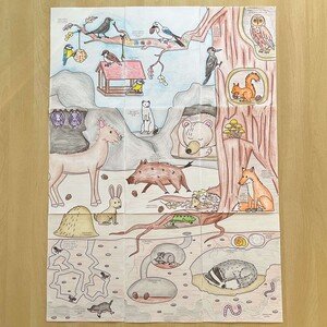 Devítidílná obří omalovánka zvířátka v zimě propojuje tvoření, spolupráci a objevování zimní přírody. Na velkém obrázku