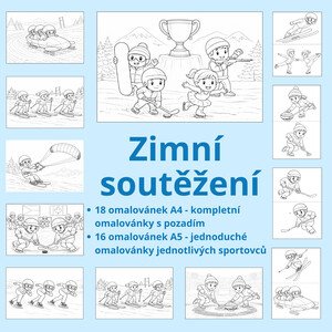 Soubor obsahuje celkem 34 omalovánek dětí při zimních soutěžích. 18 kompletních omalovánek s okolním prostředím je ve